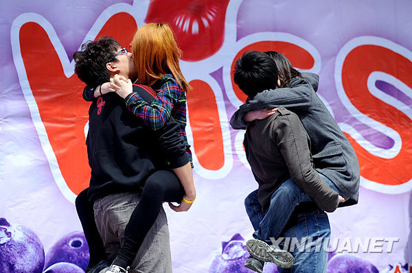 当日,在沈阳商业街——中街举办了一场别开生面的接吻大赛。比赛要求在接吻的过程中,女孩双脚不得着地,以坚持时间长短来判定比赛胜负,这场“另类”的比赛吸引了众多市民驻足观看。新华社记者姚剑锋摄