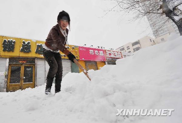 4月13日,市民在清理门前积雪。从12日中午开始,哈尔滨突降大雪。黑龙江省12日发布的暴雪蓝色预警和道路结冰黄色预警称,哈尔滨、佳木斯等地局部有大到暴雪。目前风雪仍在持续。新华社记者王建威摄
