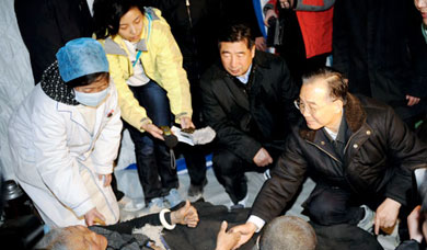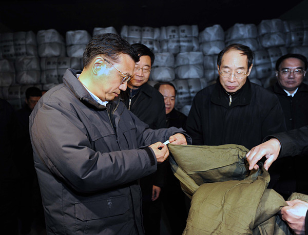 4月15日,正在辽宁考察工作的中共中央政治局常委、国务院副总理李克强,在沈阳实地察看支援青海玉树抗震救灾物资抢运工作。这是李克强在民政部沈阳救灾物资储备库仔细察看棉衣棉被厚度和质量。新华社记者 李涛 摄