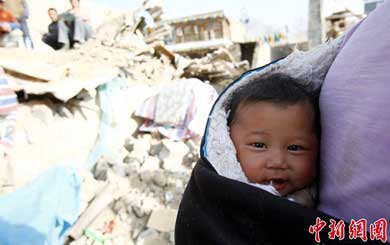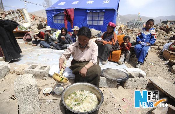 4月18日,在玉树县结古镇,受灾群众在吃午餐。当日,青海省玉树地震发生后第五天,在临时居住点暂时安顿下来的受灾群众,在废墟旁生火做饭,晾晒牛肉,灾后生活正在逐步展开。 新华社记者 江宏景 摄