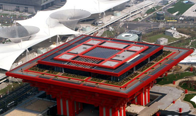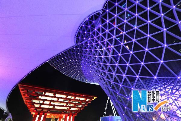 在世博园区景观灯衬映下的中国馆(4月24日摄)。上海世博会中国国家馆,建筑外观以“东方之冠”为构思主题,整体构型取自中国古代木结构建筑元素——斗拱和鼎器。在世博园的大部分区域内,游客们都能看到这座标志性的建筑。但正所谓“远近高低各不同”,处在不同的方位、不同的角度,你能欣赏到“东方之冠”迥异不同的风采神韵。新华社记者王颂摄