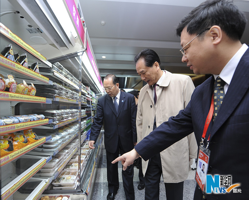 4月27日,中宣部副部长蔡名照(右二)在上海市委宣传部长杨振武(右三)的陪同下视察世博新闻中心餐饮区。当日,上海2010年世博会新闻中心正式启用。 新华社记者 杨光摄