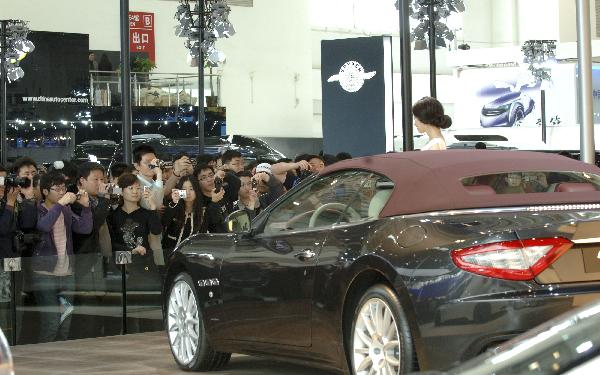 4月27日,观众在车展现场参观。当日,以“畅想绿色未来”为主题的2010(第十一届)北京国际汽车展览会迎来首个公众参观日,众多观众前往北京中国国际展览中心参观车展。新华社发 (张宇 摄)