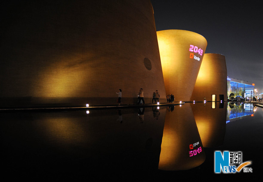 5月1日晚,上海世博园万科馆在水中倒影映衬下显得更加迷人。在上海世博园,除了可以见到穿园区而过的滔滔黄浦江,还有遍布园区的音乐喷泉、景观水池等,水让规划面积5.28平方公里的上海世博园更加灵动。新华社记者 赵戈 摄