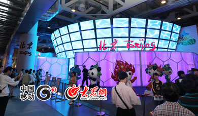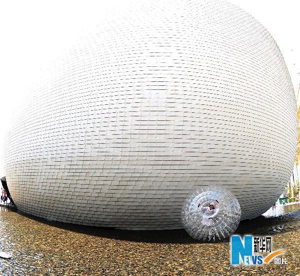 5月3日,皮特凯宁在水上步行球中向观众招手。在上海世博园的芬兰馆外,芬兰姑娘基尔西·皮特凯宁操作水上步行球欢迎游客。新华社记者徐家军摄