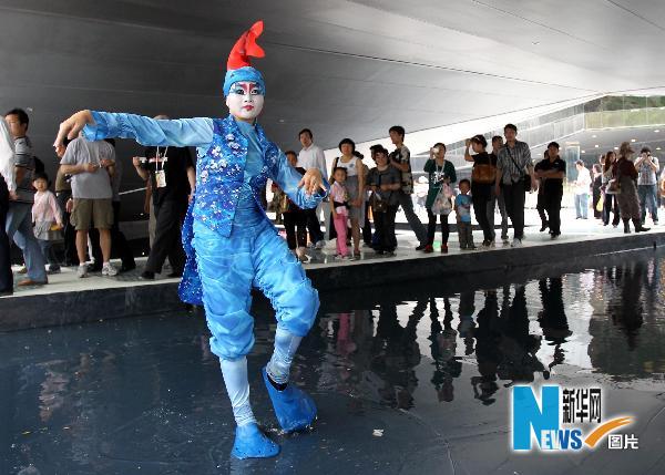 5月6日,一位“美人鱼”行走在加拿大馆室外水池中。当日,一场行为艺术在上海世博会加拿大馆上演。 新华社记者凡军摄