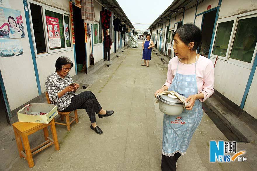 一位大妈(左)在自家板房门口纳鞋底儿,她的邻居端着电饭锅从她身旁走过(摄于5月8日)。花开两年,又见都江堰,又见都江堰的板房。从痛失家园,到睡临时帐篷,再到入住板房,灾区百姓在这蓝顶的白色小屋里重新找回了家的感觉。两年的暂居,板房已不再崭新,有了浓浓的生活气息。记者赶到都江堰幸福家园板房区时,正值炊烟升腾,家家都在忙着张罗晚饭,空气中弥漫着一股家常炖菜的味道。走在板房与板房之间的小道上,鸟笼、花花草草、洗晾的衣服、大红灯笼……这些在其他城市百姓家里常见的景物这里一样都不少,恍惚间仿佛置身于城市里狭窄而温馨的小弄堂。幸福家园板房区旁,援建的新房已拔地而起,今年年底以前,这些板房的主人将悉数摇号搬入新居。 新华社记者 郑悦摄