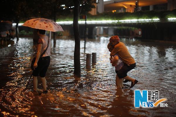 5月14日晚,市民在广州中山涉水通过马路。新华社记者 吴鲁 摄
