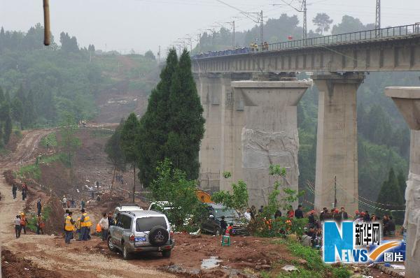 5月16日,现场抢险队伍在加紧施工。 5月15日12时25分,遂(宁)渝铁路潼南段因山体落石造成线路中断。发现险情后,铁路部门立即启动应急预案,组织抢险队伍赶赴现场抓紧检查抢修线路。新华社记者 陈诚 摄