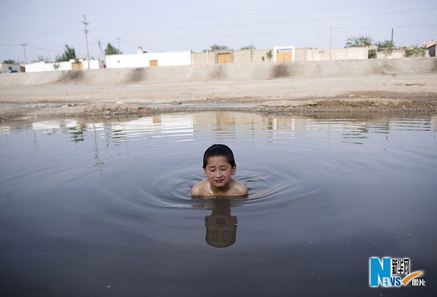 5月19日,库车第二小学二年级学生努热河买提在老城团结新桥旁的河水里玩耍。