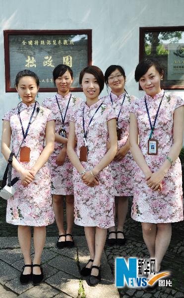 5月24日,新上岗的“旗袍导游”亮相苏州拙政园。当日,苏州拙政园经过公开招聘的13位“旗袍导游”整齐亮相。据了解,这13位导游员大部分来自苏州高校,她们将为来园游客进行免费讲解。新华社发(朱桂根 摄)