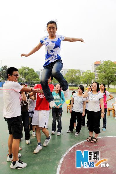 5月25日,湖北省宜昌市第七中学的高三学生参加“减压游戏”。当日,湖北省宜昌市第七中学举行高考“减压游戏”活动,请心理咨询师来到校园,为500多名即将参加高考的学生“减压”。 新华社发(黄翔摄)