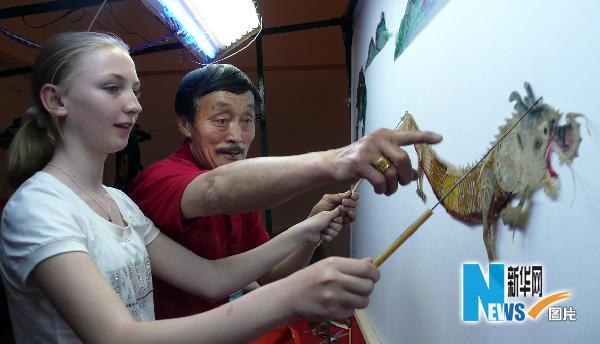 5月26日,俄罗斯儿童在大连赏槐会“民族风情周”活动中体验“皮影戏”。当日,第21届大连赏槐会“民族风情周”活动在南山风情一条街举行。大连复州城民间艺人表演的传统皮影戏受到中外游客的喜爱,俄罗斯儿童到后台向老艺人们学起了“皮影戏”。新华社发(卢国忠 摄)