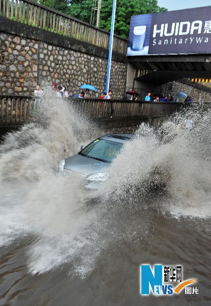 5月27日,车辆涉水通过广西柳州市红碑路积水路段。