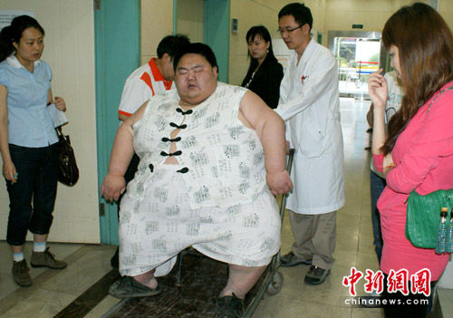 身高1.58米、体重225公斤,被媒体称为“中国第一胖”的梁用因心肺衰退、腹疼肿胀、肝功能异常危及生命5月27日前往重庆第三军医大学新桥医院求治。院方组织该院消化内科、呼吸科、血液科、麻醉科等10来个科室的数十位专家进行特大会诊。图为家人和医护人员正在用板车推梁用去做检查。中新社发 李春梅 摄