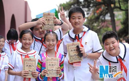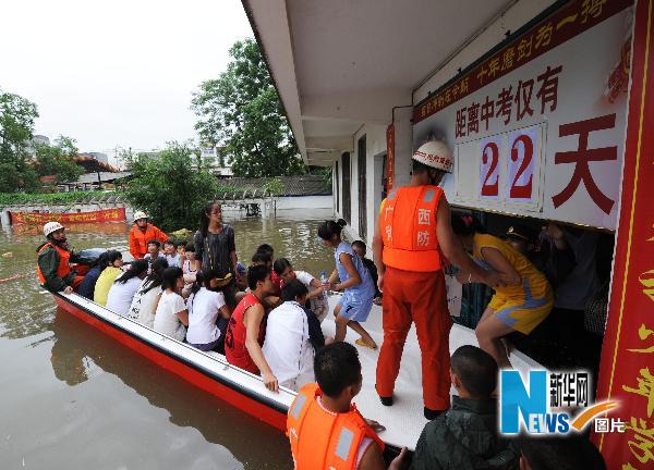 6月1日,消防战士在来宾市实验中学转移被围困的学生。