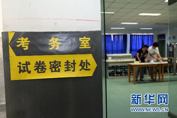 6月4日,考务人员在北京166中学考点进行准备工作。