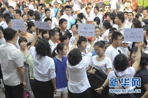 6月7日,几名教师在哈尔滨市第三中学考场外举着标有考场号的牌子为考生服务。当日是2010年全国高考第一天,共有957万名考生走进考场。 新华社发(张清云 摄)