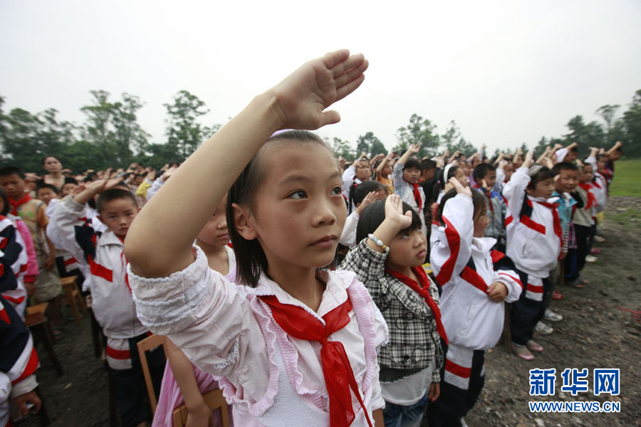 洪雅(四川),2010年6月30日 关爱留守儿童 “彩虹家园”又添新教育基地 6月29日,在在四川省眉山市洪雅县,符场中心小学的学生在揭牌仪式上向国旗敬礼。当日,以关爱留守儿童为主旨的“彩虹家园”工程今年首个新增教育基地在四川省眉山市洪雅县符场中心小学揭牌。该小学拥有留守儿童212名,他们将利用“彩虹家园”提供的视频设施,增进与外出打工父母之间的联系。“彩虹家园”工程由联合利华公司携手全国妇联开展,通过在各地兴建教育基地,并利用视频连线等方式,联动乡村留守儿童与城市务工的父母,促进留守儿童的健康成长。新华社记者 任正来 摄