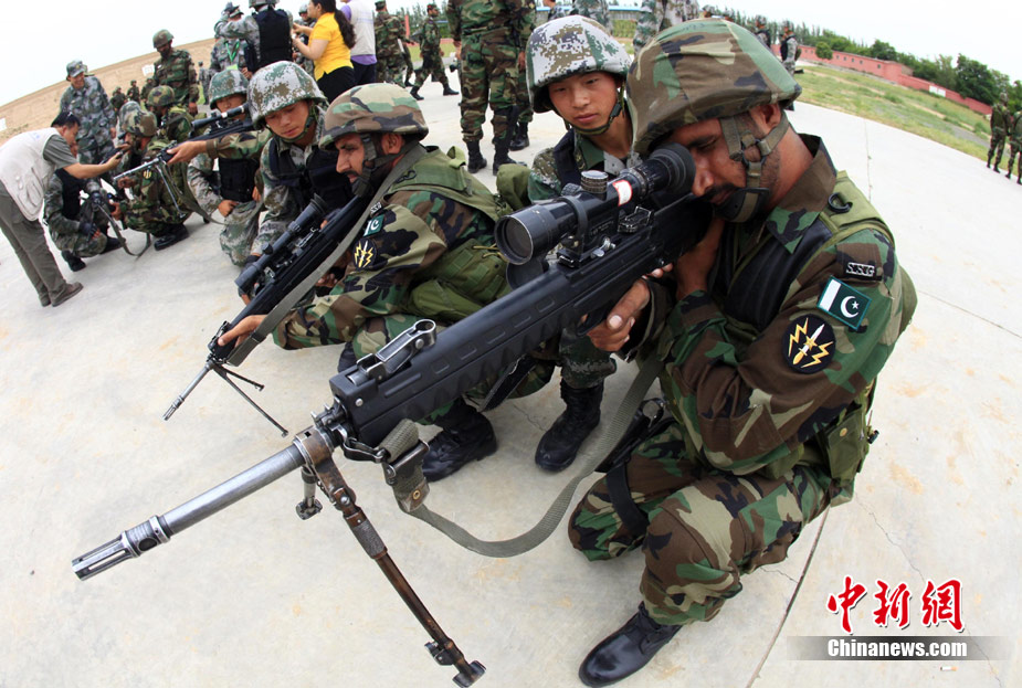7月3日,代号“友谊—2010”的中国巴基斯坦反恐联合训练在中国宁夏青铜峡地区展开,此次训练主要以边境地区山地联合反恐作战为课题,分为展示交流、混编同训、综合演练三个阶段。图为中国巴基斯坦两军特战部队交流展示反恐装备。中新社发 杜洋 摄