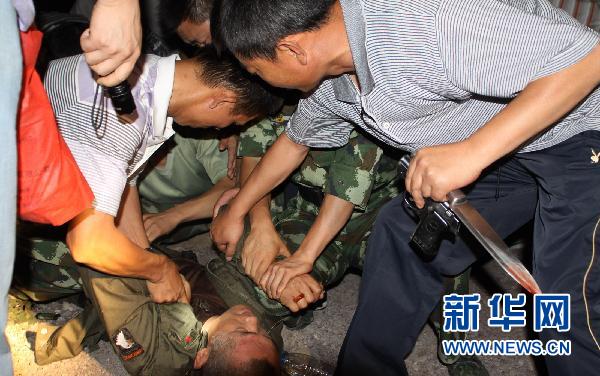 7月3日晚,武警宁夏总队石嘴山市支队官兵将劫持人质的犯罪嫌疑人抓获。当晚23时50分许,武警宁夏总队石嘴山市支队官兵经过长达3个多小时的谈判后,与当地公安干警、消防官兵共同成功处置一起发生在宁夏石嘴山市大武口区武当庙附近的持刀劫持人质案件,犯罪嫌疑人被成功抓获,人质安全获救。据了解,犯罪嫌疑人徐某以找朋友名义乘坐张女士的出租车,当车子离开市区后行至武当庙附近时,犯罪嫌疑人徐某持刀将出租车司机劫持为人质,并向出租车司机家人勒索5万元现金。目前,此案正在进一步审理当中。 新华社发(刘东日 摄)