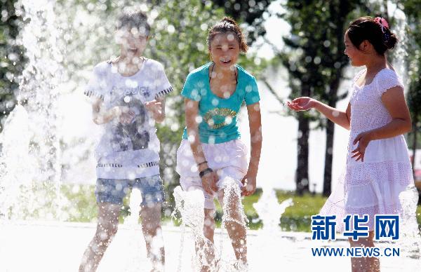 连日来,天津市区的气温持续上升,当地气象部门已将高温预警升级为橙色。天津大学定时开放的喷泉广场,成为市民和学生避暑降温好去处。新华社发(李想 摄)
