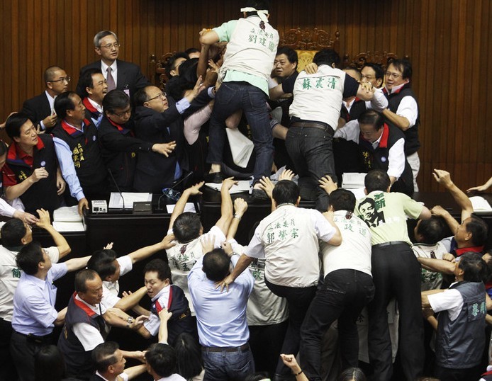 7月8日,民进党“立委”试图阻止“立法院长”王金平议事进行,以“叠人墙”方式攻占主席台,遭国民党“立委”阻挡。