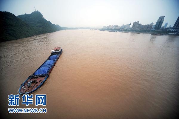 7月11日拍摄的长江宜昌段水位上涨的江面。当日凌晨,今年长江入汛以来的首次洪峰到达三峡大坝。中国长江三峡集团公司实测结果显示,上午此次洪峰的最大流量达38500立方米/秒,为今年三峡最大入库流量。新华社发(刘曙松 摄)