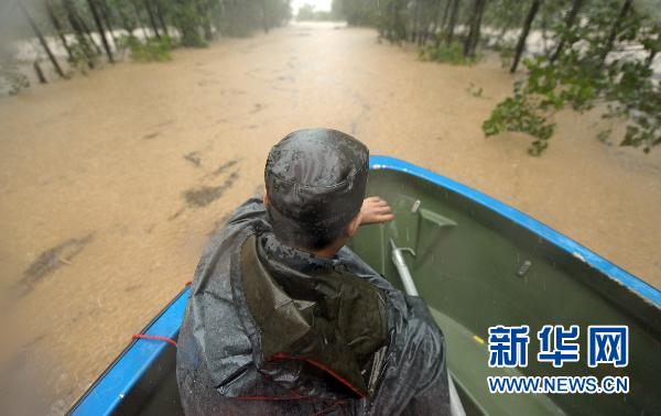 7月13日,安徽池州齐石公路从新华村至白洋村路段被水淹没。当日,受强暴雨影响,安徽省池州市贵池区暴发山洪,多处道路被冲断,山体滑坡,洪水蔓延,造成梅街、梅村、棠溪三个乡镇45个村的5万多名群众受困。武警官兵、民兵预备役人员和当地干群已全力投入抗洪抢险。目前,无人员伤亡报告。新华社记者 郭晨 摄