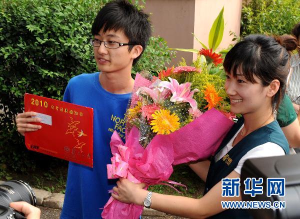 7月16日,沈阳市邮政速递公司的工作人员(右)向收到高考录取通知书的邢常瑞(左)赠送鲜花。当日,沈阳市邮政速递公司将2010年沈阳市第一份高考录取通知书送到考生手中,高考录取通知书专递工作拉开帷幕。预计今年沈阳市邮政速递公司将收寄通知书专递10万件左右,投递通知书专递5万件左右。新华社记者 李钢 摄