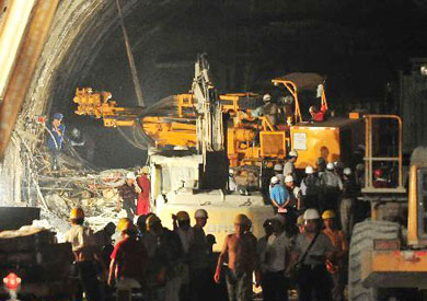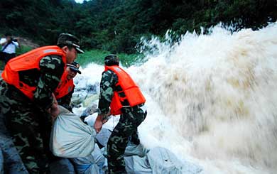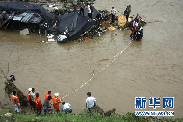 7月15日夜晚,强降雨天气袭击湖北省宜昌市,导致夷陵区黄柏河西部支流水域突发山洪,宜(昌)巴(东)高速第七标段工人被困河中。夷陵区消防大队接到报警后,火速赶赴现场,经过近8小时的紧张营救,成功将60余名被困工人救出。新华社发(方佩 摄)