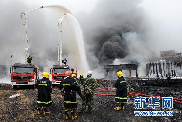 7月17日,消防队员在火灾现场扑火。当日10时,大连市政府召开新闻发布会,宣布大连新港输油管道爆炸现场储油罐的所有阀门全部关闭,火势基本扑灭,事故未造成人员伤亡。 7月16日18时许,大连新港附近中石油的一条输油管道发生爆炸起火。起火管道为直径900毫米的原油储罐陆地输油管线,后引起700毫米管线起火,油罐没有起火。燃烧产生气体主要为含硫和芳烃类气体,无剧毒。新华社记者 李钢 摄