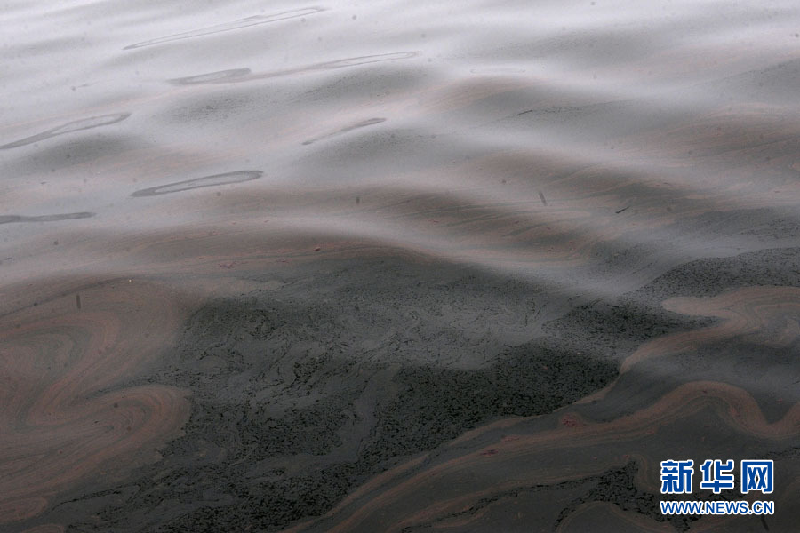 2010年7月17日 大连全面展开海上清污 大连新港输油管道爆炸后海面上大片的油污(7月17日摄)。大连新港输油管线爆炸起火事故,至少已造成附近海域50平方公里的海面污染,海上清污工作17日全面展开。截至17日17时,辽宁海事局近百名海事工作人员已经在溢油水域布设围油栏约7000米。由海事部门组织的近20艘清污船舶,正在对海上的油污开展清除作业,包括辽宁海事局的海巡028、海巡021等四艘巡逻船,一直在事发水域监控油污和布设围油栏。新华社记者 任勇摄