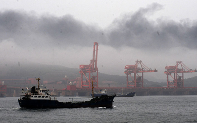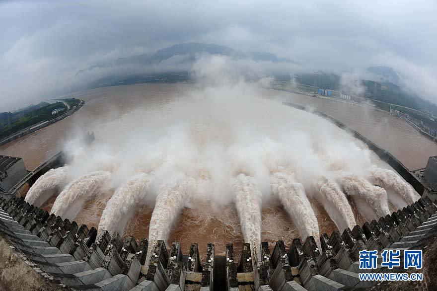 7月20日上午,三峡大坝开启9个深孔泄洪,下泄流量控制在4万立方米/秒。 7月20日8时,三峡迎来建成后的首次特大洪峰,流量达7万立方米/秒,刷新了1998年以来通过宜昌的最大峰值记录。为保证通航安全,三峡双线五级船闸已于19日11时停航,这是今年以来三峡船闸南北线首次同时停航。与此同时,载货汽车滚装船翻坝转运工作正式启动。长江三峡通航管理局表示,当三峡入库流量小于4.5万立方米/秒时,三峡船闸将复航。 新华社记者 程敏摄
