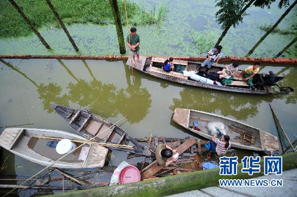 由于近日连续遭受暴雨袭击,湖北省洪湖市新滩镇内涝严重,农作物损失惨重。正常水位23米多的沙套湖目前已经涨至25.91米,创历史最高水位。位于湖区内的洪湖市新滩镇沙套湖大垸已经被水围困9天,由于降雨还在继续,水难以排出,村民们的食物和用水难以为继。目前,受灾村民正在展开各种方式的自救行动,守护自己的家园,等待洪水退去。新华社记者 郝同前 摄