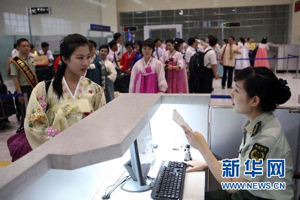 7月21日,朝鲜血海歌剧团《红楼梦》剧组的演职人员在辽宁丹东边防检查站办理出境手续。