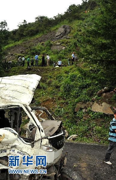 7月26日,翻下高坎的肇事货车严重损毁。 7月25日上午7时许,湖北省恩施州宣恩县长潭河侗族乡境内发生一起交通事故,一辆载有7人的货车撞上3个防护墩后,从公路右侧翻下120米的高坎,造成6人死亡,1人重伤。目前,事故原因还在进一步调查中,善后工作仍在继续。新华社发