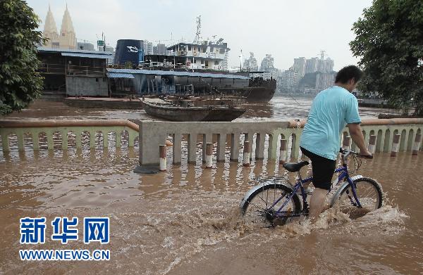 7月27日,在重庆市渝中区滨江路,一位市民在洪水中骑自行车。当日,由于长江水位不断上涨,重庆部分临江地区在清理完淤泥后,再次被上涨的洪水淹没。 新华社记者 陈诚 摄