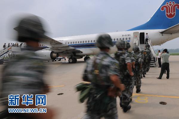 这是参演官兵正在登机(7月27日摄)。 7月27日,济南军区某集团军举行实战航空输送演练,将兵力从中原腹地紧急投送至胶东半岛某滨海城市。演练将航空输送准备、快速装载和快速卸载等环节一一展现。警戒、卸载、集结、撤离,参演的陆空各方娴熟配合,一体联动。这是该集团军首次进行航空输送,并采取军民结合的方式,开展实战背景下的航空输送演练。新华社发(张振兴 摄)