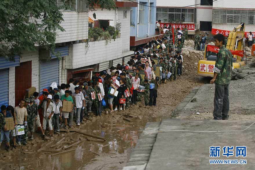 8月9日,在甘肃舟曲灾区,救援人员和当地群众拿着救援物资,走在被泥石埋没的街道上。甘肃省舟曲县特大泥石流灾害发生后,抢险救灾行动迅速展开。目前,舟曲灾区抢险救灾仍面临急需尽快处理堰塞湖、疏通白龙江河道,急需恢复供水系统,急需尽快恢复电力、道路、通讯等基础设施,清淤工作困难重重,急需饮用水和方便食品,急需支援中小学教材等六项艰巨任务。新华社发
