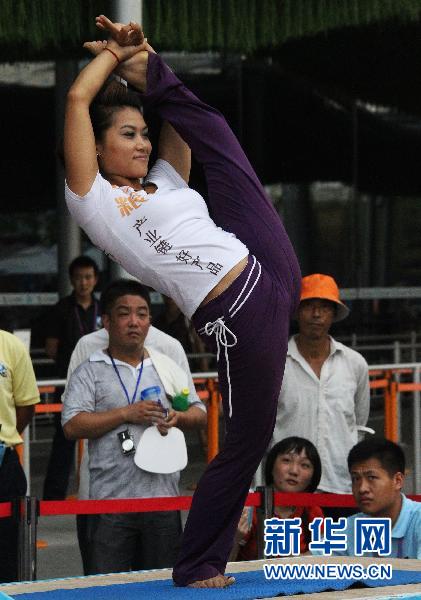 8月11日,一位演员在表演软体舞蹈。当日,上海世博园内气温接近38摄氏度,一批舞蹈演员在市民广场上冒着酷暑为游客表演“热舞”。 新华社记者汪永基摄