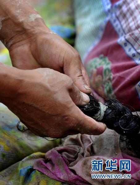 当日,救援人员将遇难的8岁女孩韩璇从5米多深的淤泥中挖出,其父亲韩如栋用清水将女儿清洗干净后,又为女儿最后一次编辫子。在甘肃省甘南藏族自治州舟曲县“8·7”特大泥石流灾害中,韩如栋的家被泥石流冲毁,其父母、妻子、女儿、弟妹等9人遇难或失踪。新华社记者陶明摄