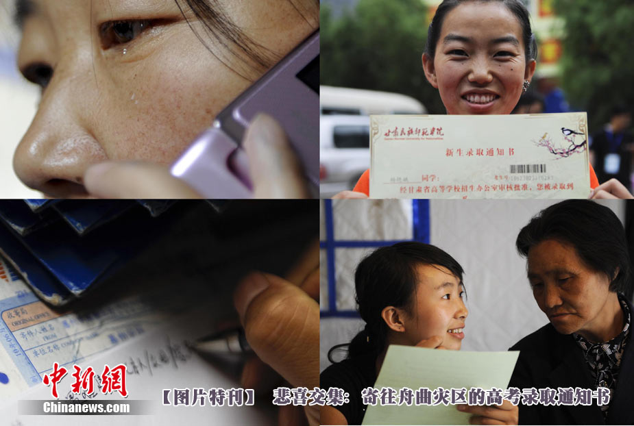 8月14日,甘肃舟曲灾区的高考录取通知书正在发放过程中,学生们接过火红色的录取通知书信封,眼里有藏不住的笑意。然而,有一些通知书却永远无法发出了。截至上午10点30分,舟曲一中收发室当天共发出7份录取通知书,还有30多封正等待领取。中新社发 廖攀 摄