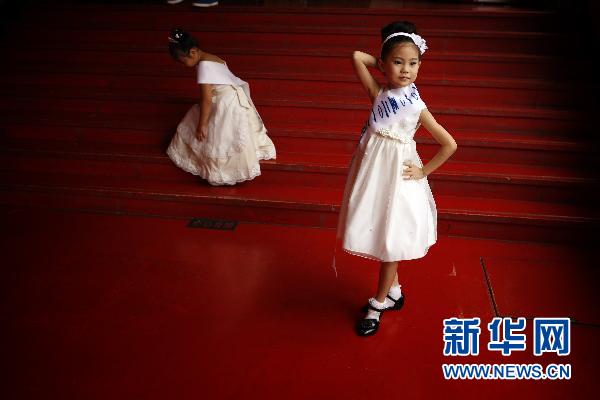8月19日,参赛小选手李秋含(前)在做登台前的准备。 8月18日至19日,2010至2011年度国际小公主(王子)中国区总决赛在北京举行,来自全国各地的近150名孩子在这里争夺各类奖项。参赛选手年龄在2岁至18岁之间。获奖选手将有机会赢得世界上专为年轻女孩设计的“灰姑娘”奖学金。浓妆、高跟鞋、猫步、竞争,这些昔日只出现在成人世界中的词汇,如今也成了这些参赛小选手生活中的关键词。家长、幼儿教育机构、模特经纪机构则联手将这些孩子推向了一条新的“成名之路”。新华社记者 沈伯韩摄