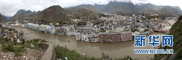 2010年8月20日 我的家,在舟曲白龙江上 8月20日,白龙江穿城而过,两岸房屋还浸在水中(拼接照片)。新华社记者 宋立东 任正来 高健钧 摄影报道