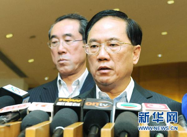 8月23日,香港特区行政长官曾荫权(右)就菲律宾劫持事件会见记者。香港特区行政长官曾荫权23日晚表示,对有香港游客在菲律宾劫持事件中遇害感到十分悲伤,对凶手冷血的行为感到愤怒。“我要向死伤者家属致以最深切的慰问,特区政府会向伤者和家属提供一些可能的协助,帮他们度过这个困难时刻。” 新华社发(李秋婵摄)