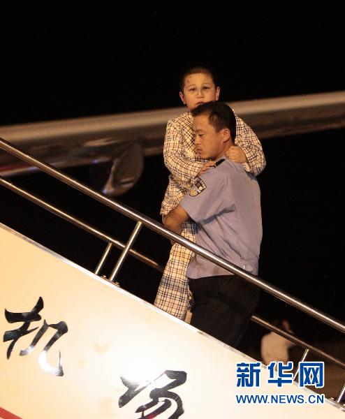 8月25日,一名警察将一名小伤员送上飞机。当日,南方航空公司一架包机将12位伤情较重的伊春空难伤员从伊春转运到哈尔滨,接受进一步治疗。 新华社记者邢广利摄