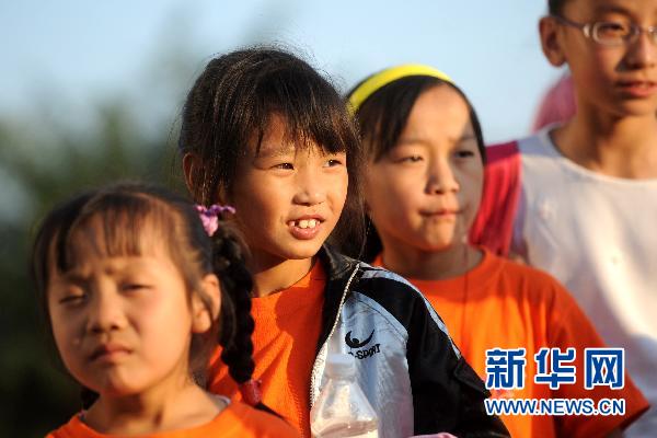 8月26日,在泥石流灾害中成为孤儿的舟曲城关二小学生李倩(左二)在兰州中川机场准备出发。当日,由中华儿童慈善救助基金会组织的12名舟曲泥石流灾害孤儿从兰州中川机场出发,赴北京进行为期一周的休养。在京休养期间,这些孩子们将参观天安门、长城和奥运会场馆,并与此前已经在北京的玉树地震灾区孤儿相聚。新华社记者 聂建江 摄