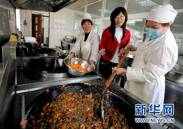 辽宁省沈阳市岸英小学的公共营养师张宇(中)正在学校食堂指导厨师炒菜(2009年11月4日摄)。校园公共营养师运用营养学的知识和方法,通过计算学生对各种营养素的需求量,制定合理的营养食谱,促进儿童和青少年健康成长。新华社发(张文魁摄)