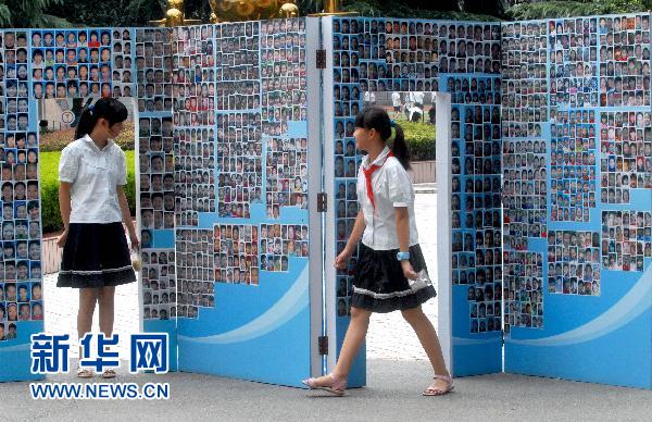 9月1日,武汉市育才小学两名学生在“跨越门”上寻找自已的笑脸。新学期开学的第一天,武汉市育才小学在校园里设立一处“跨越门”,将该校3000多名学生的笑脸照片贴在上面,让新生们感受新校园新气象。新华社发